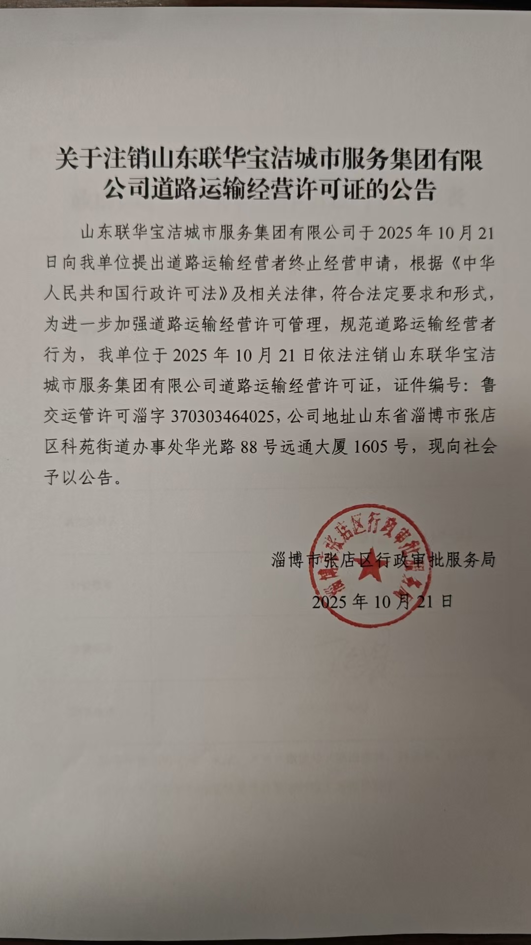关于注销山东联华宝洁城市服务集团有限公司道路运输经营许可证的公告