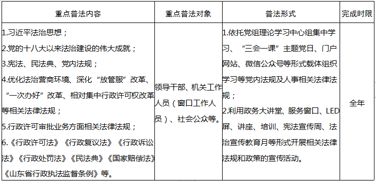 为进一步强化普法工作的主体责任,落实国家机关“谁执法谁普法”普法责任制,全面推进张店区行政审批服务局法治建设工作,根据《区委宣传部、区司法局关于在全区开展法治宣传教育的第八个五年规划(2021—2025年)》和《关于印发〈张店区区级国家机关2022年度普法责任清单〉的通知》要求,现将我局2022年度普法工作安排如下: